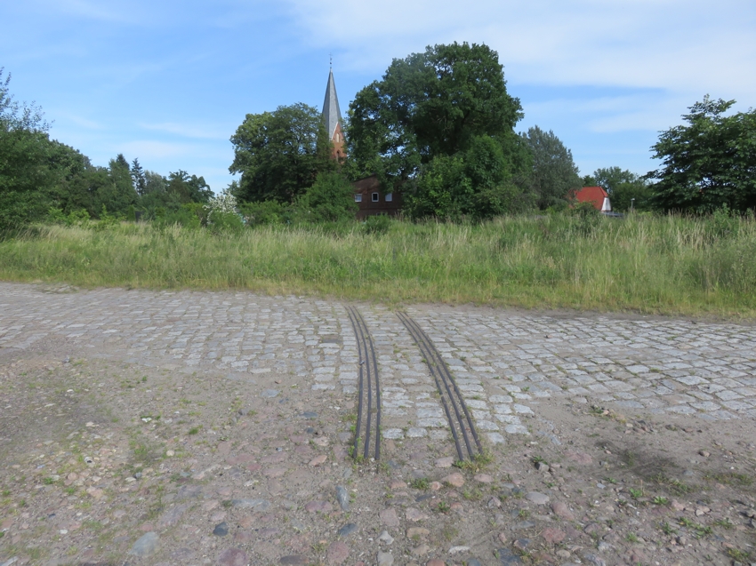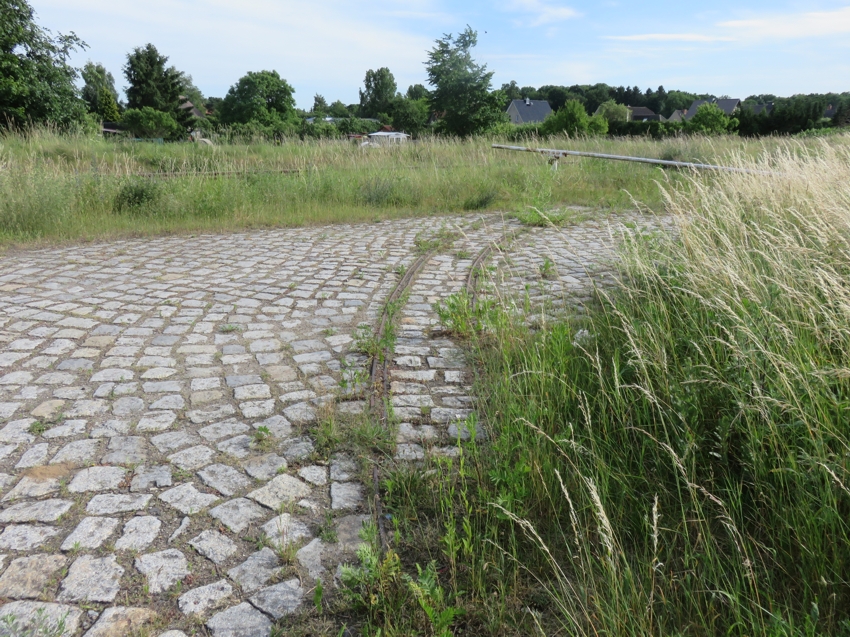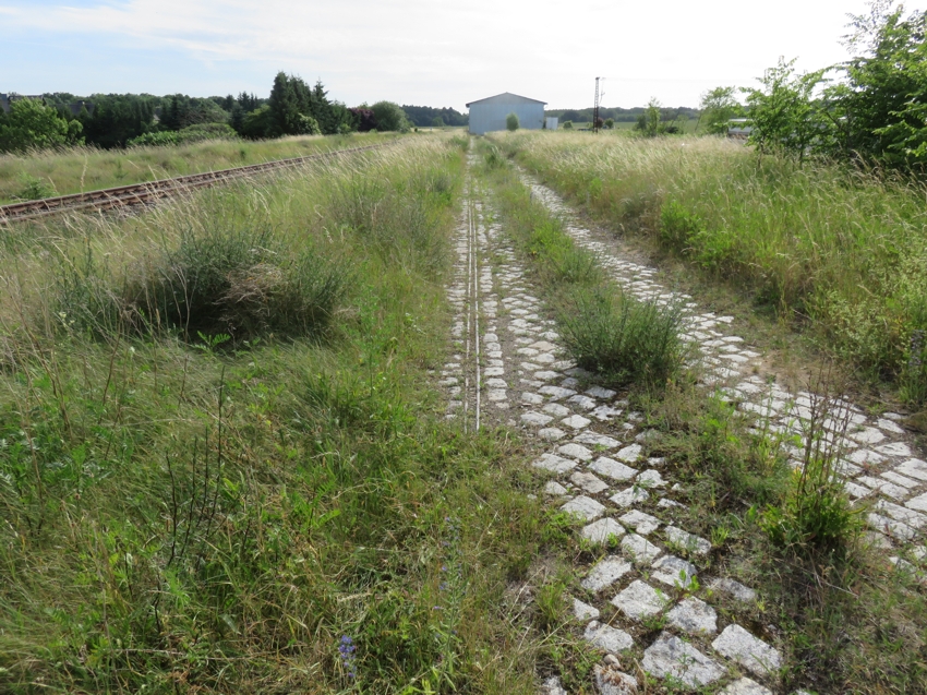 | Reste einer Feldbahn (vermutlich aus Richtung Welzin führen zur ehemaligen Ladestraße in Richtung einer Lagerhalle. |