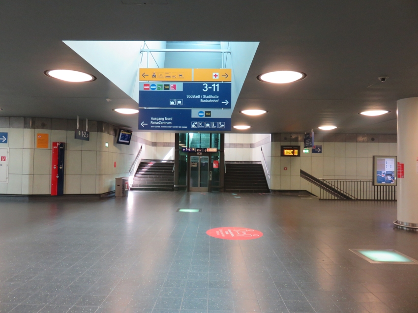 Empfangshalle des EG Südstadt; links die Treppe zum Personentunnel;