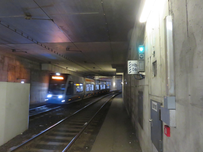 ... und in Richtung Innenstadt; An der Tunnelwand sieht man eines der Lichtzeichenanlagen, die den Blockabstand der Bahnen regeln. Grünes Licht bedeutet, dass der vorliegende Blockabschnitt frei ist. Die nächste Bahn darf folgen. Hb bedeutet Hauptbahnhof und 06 ist die Nummer der Lichtzeichenanlage. Die schwarz-weiße Schraffur hat auch eine Bedeutung. Auf dem anderen Gleis kommt eine Bahn aus der Innenstadt. |