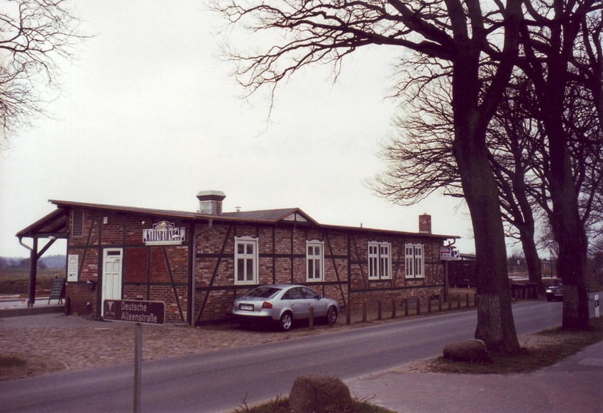 wiederaufgebautes oder rekonstruiertes Stationsgebäude am erneuerten Hausbahnsteig.
