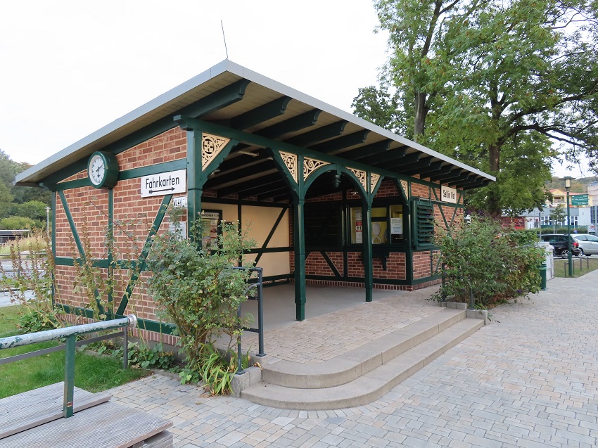 Stationsgebäude mit Fahrkartenausgabe und Unterstand zu sehen. |