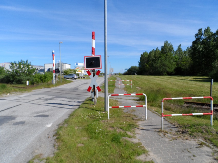 Hier quert das Gleis 205 den BÜ kurz vor der Abfahrt zum Fährterminal. Die nach
