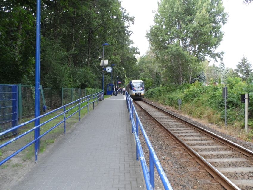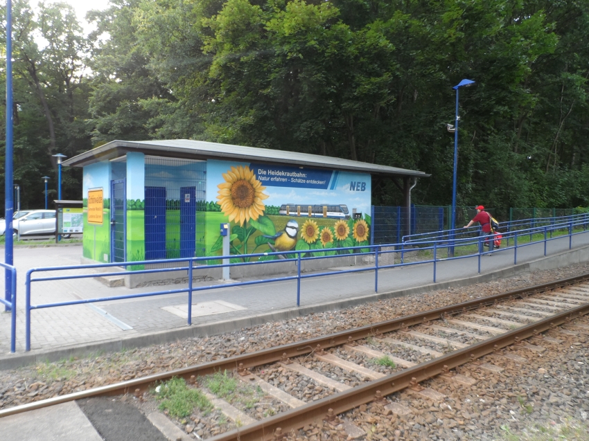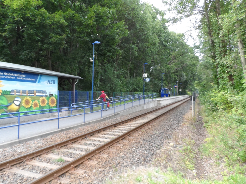 | Der Haltepunkt südlich von Basdorf ist der aktuelle der NEB. Ob er nach Wiederaufnahme des Betriebes auf der Stammbahn noch angefahren wird, ist fraglich. |
