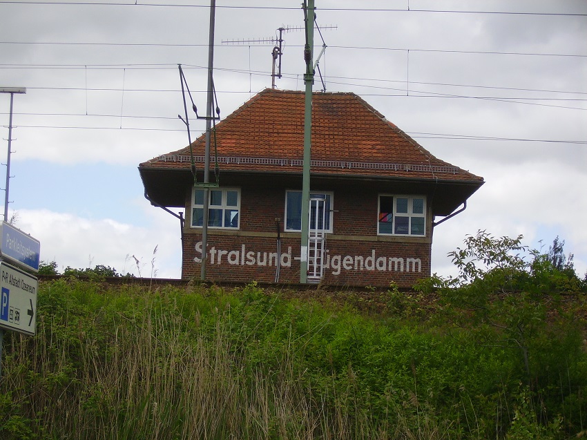 | Der Bahnhof Rügendamm liegt am südöstlichen Stadtrand sowohl auf dem Festland