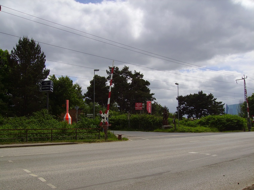 | Bahnübergang zum Dänholm; Früher bediente ein Schrankenposten die Schranken, heute der Weichenwärter auf Stw Zig. |