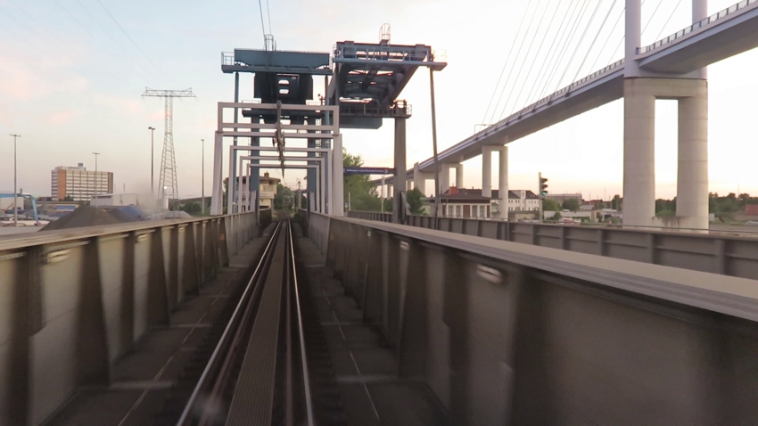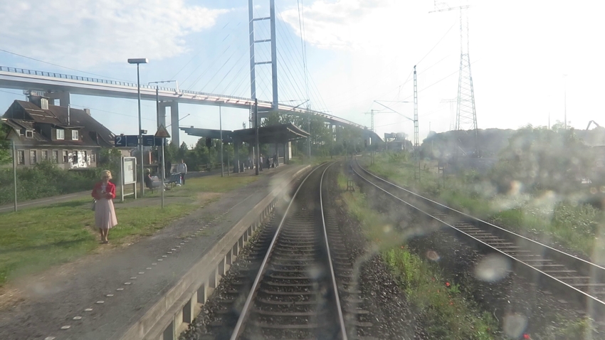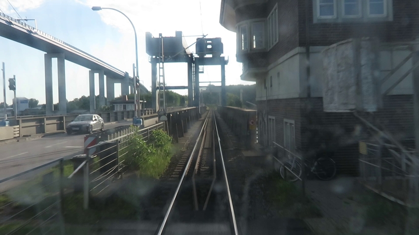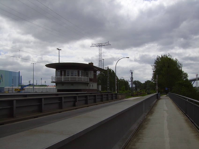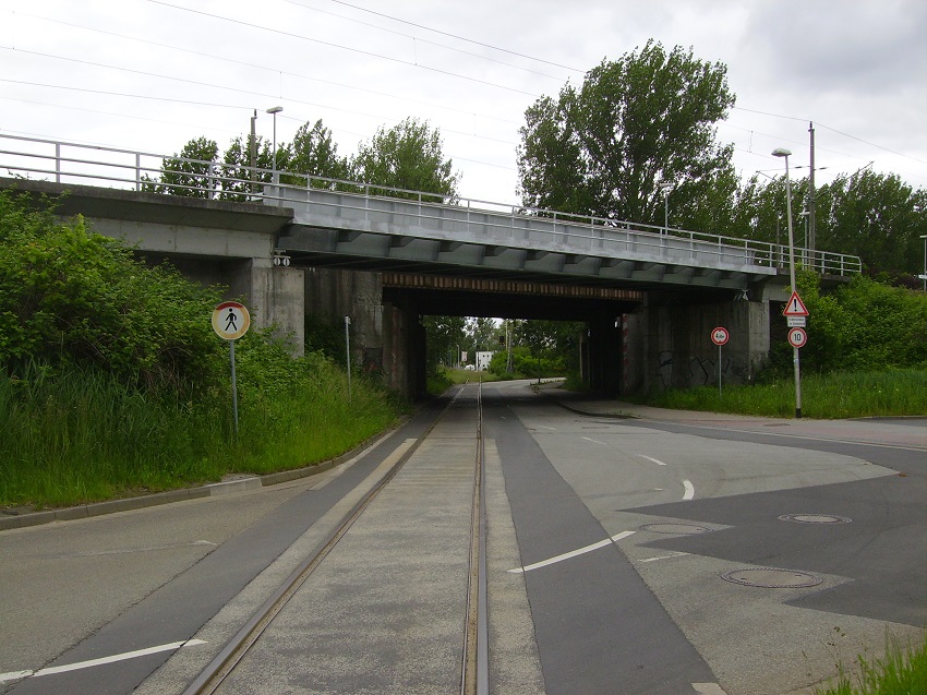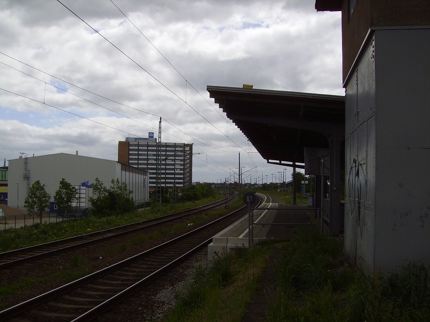 | Unter den Brücken verläuft das Anschlussbahngleis vom Nordhafen zur Werft. Die Lücke auf dem Bahnsteig gabe es zur Zeit des langen Bahnsteigs natürlich nicht. |