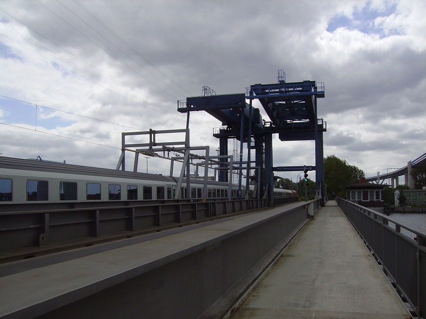 | Gerade fährt ein IC über die Brücke. In dem kleinen Gebäude rechts an der Brücke steuert der Brückenwärter die Klappbrücke. Nur zu den planmäßigen Brückenzügen ist der Brückenwärter vor Ort. |