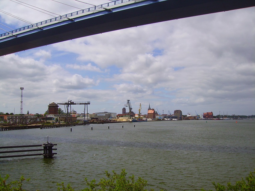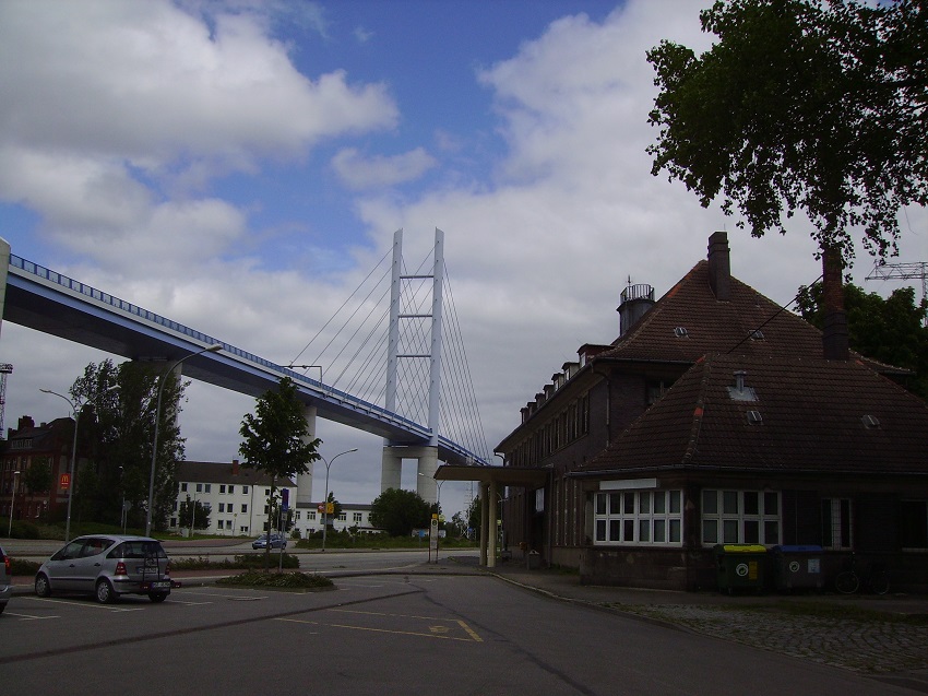 | daneben die Rügenbrücke mit ihrem Pylon |