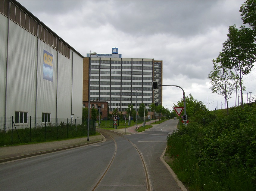 | Blick in Richtung Stw Rüf; Links steht das leere Verwaltungshochhaus der Werft, seinerzeit das modernste Bürogebäude der DDR. |