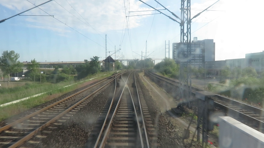 | links das Gleis in Richtung Hbf, rechts vom befahrenen Gleis das Gleis vom Abzweig Srg, daneben neugebaute Gleise für die Zufahrt zum Frankenhafen |