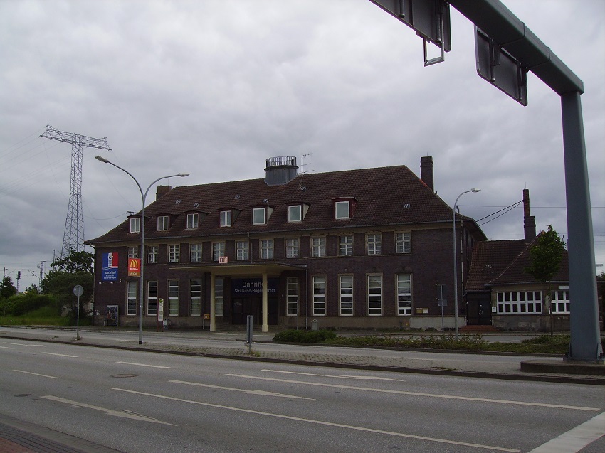 als auch ein kleines Stück auf der Insel Großer Dänholm verbunden durch die Ziegelgrabenbrücke. Vom Bahnhof aus werden die Hafengebiete Stadthafen, Nordhafen, Südhafen und Frankenhafen bedient. Den Bahnbetrieb wickeln die Stellwerke Rüf (Fdl) und Zig (Ww) ab. Das Empfangsgebäude steht seit einigen Jahren komplett leer und verfällt nach einem Dachstuhlbrand. Das Dach wurde danach nur halbherzig gesichert und so wird das große Gebäude immer mehr zum Schandfleck. Aber Bahnreisende müssen trotzdem durch das Gebäude zur Bahnsteigunterführung gehen und so ist auch hier der Vandalismus mehr oder weniger zu Hause. Eigentlich wäre der Durchgang gar nicht nötig, wenn man die Verbindung vom EG zum Tunnel öffnen/wegreißen würde. Dann könnten die Reisenden um das Gebäude herum gehen. |