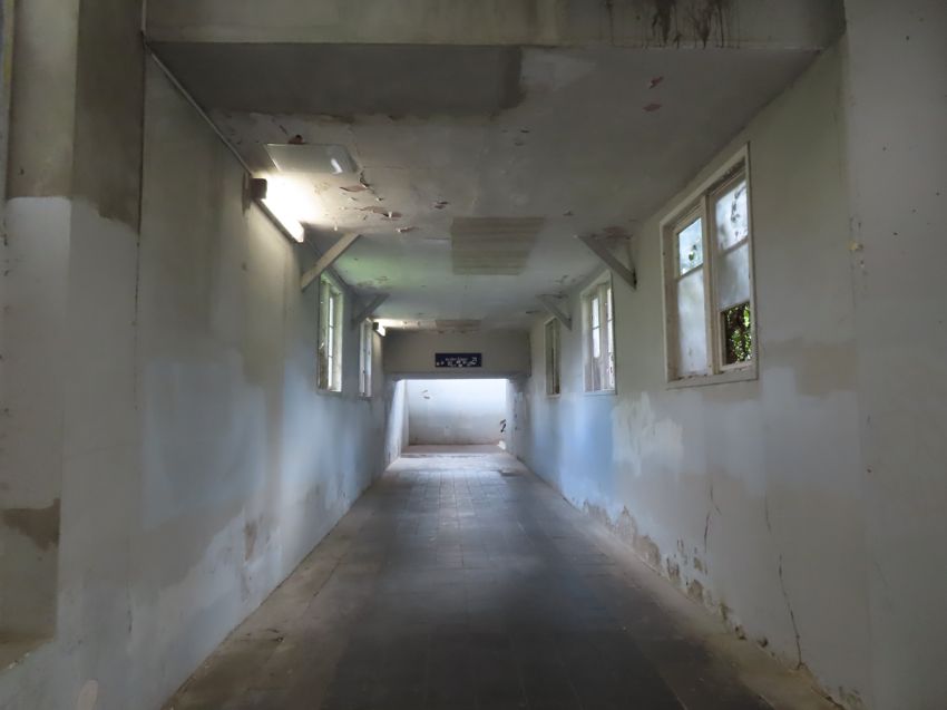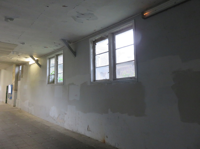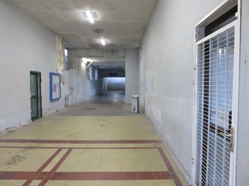 | Auf dem Weg von der Bahnhofshalle zum Bahnsteig muss man durch diesen verkommenen Verbindungsbau gehen. |