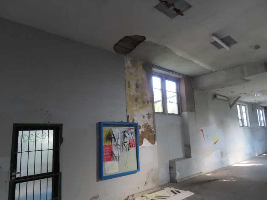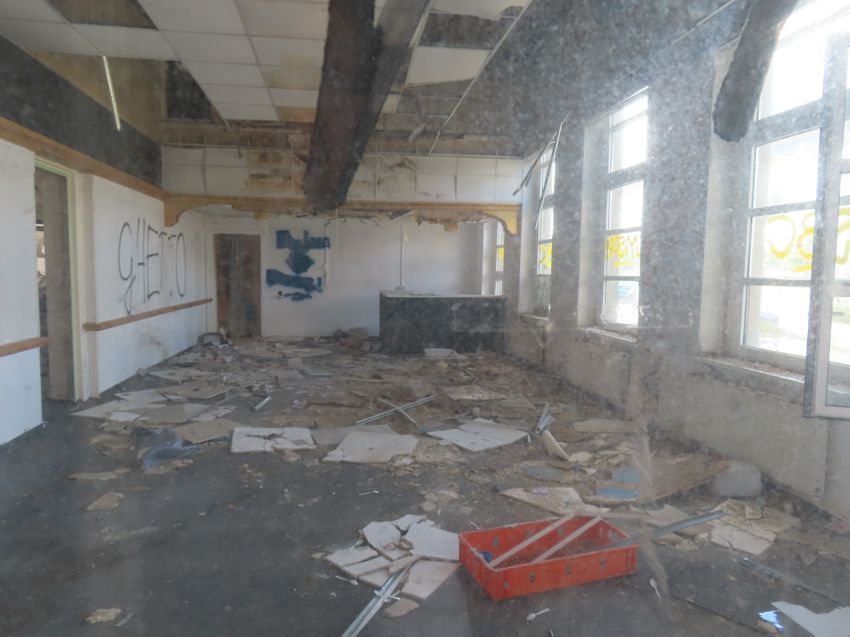 | Am und im nach dem Brand provisorisch gesicherten EG ist seitdem nichts mehr passiert, um das Gebäude in einem halbwegs brauchbaren Zustand zu halten. Im Gegenteil, Zerstörung überall! |