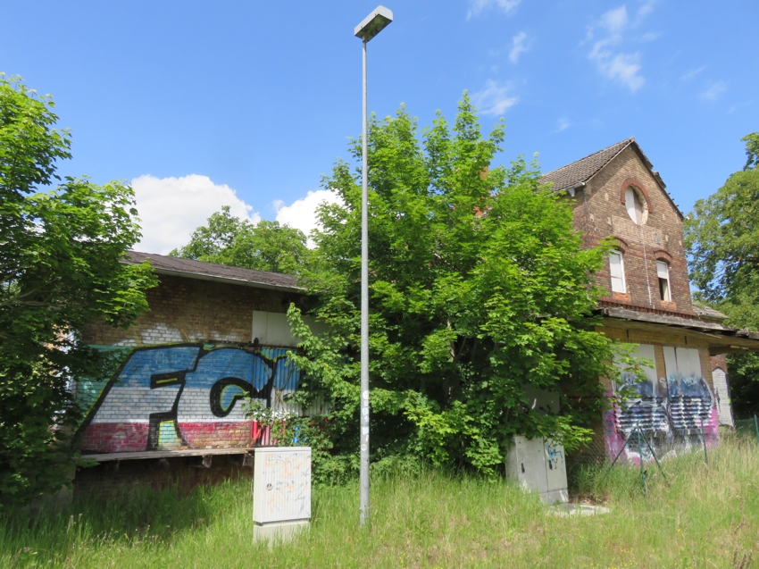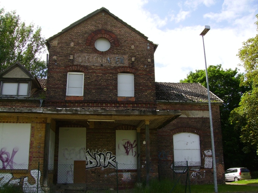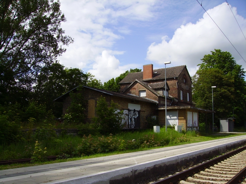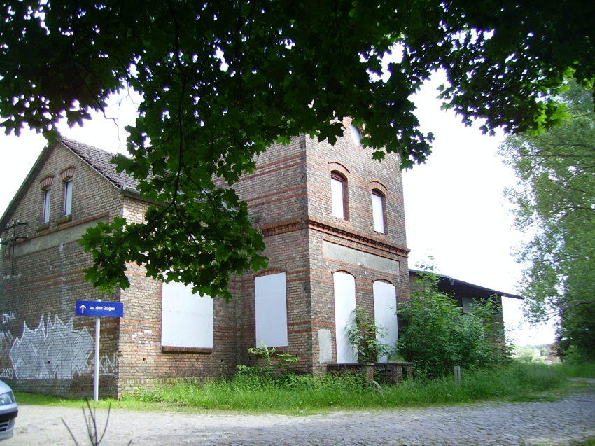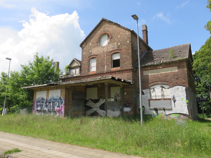 | Das Empfangsgebäude steht seit vieloen Jahren leer und verfällt immer mehr. Der Bahnsteig wurde zwar modernisiert, jedoch nicht erhöht. |